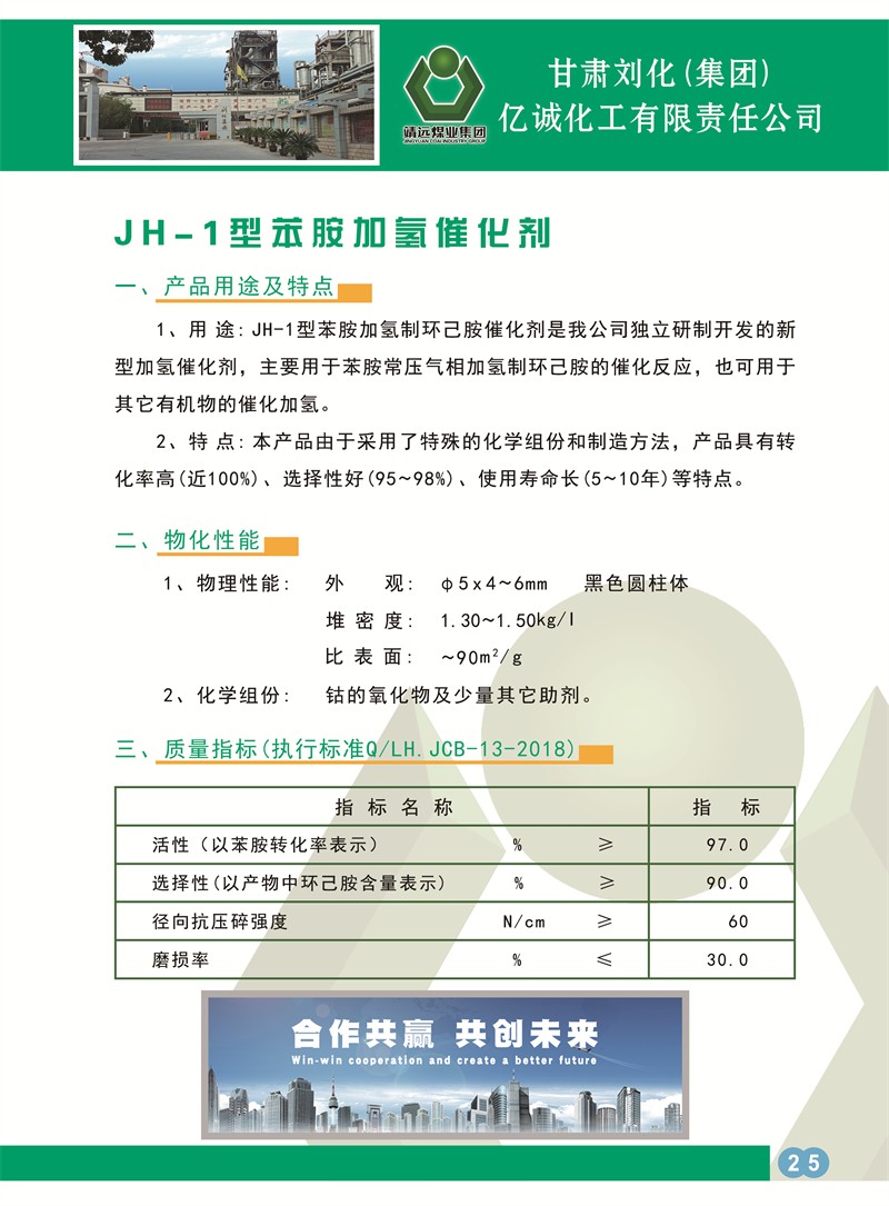 1、用 途: JH-1型苯胺加氫制環(huán)已胺催化劑是我公司獨立研制開(kāi)發(fā)的新型加氫催化劑,主要用于苯胺常壓氣相加氫制環(huán)己胺的催化反應,也可用于其它有機物的催化加氫。